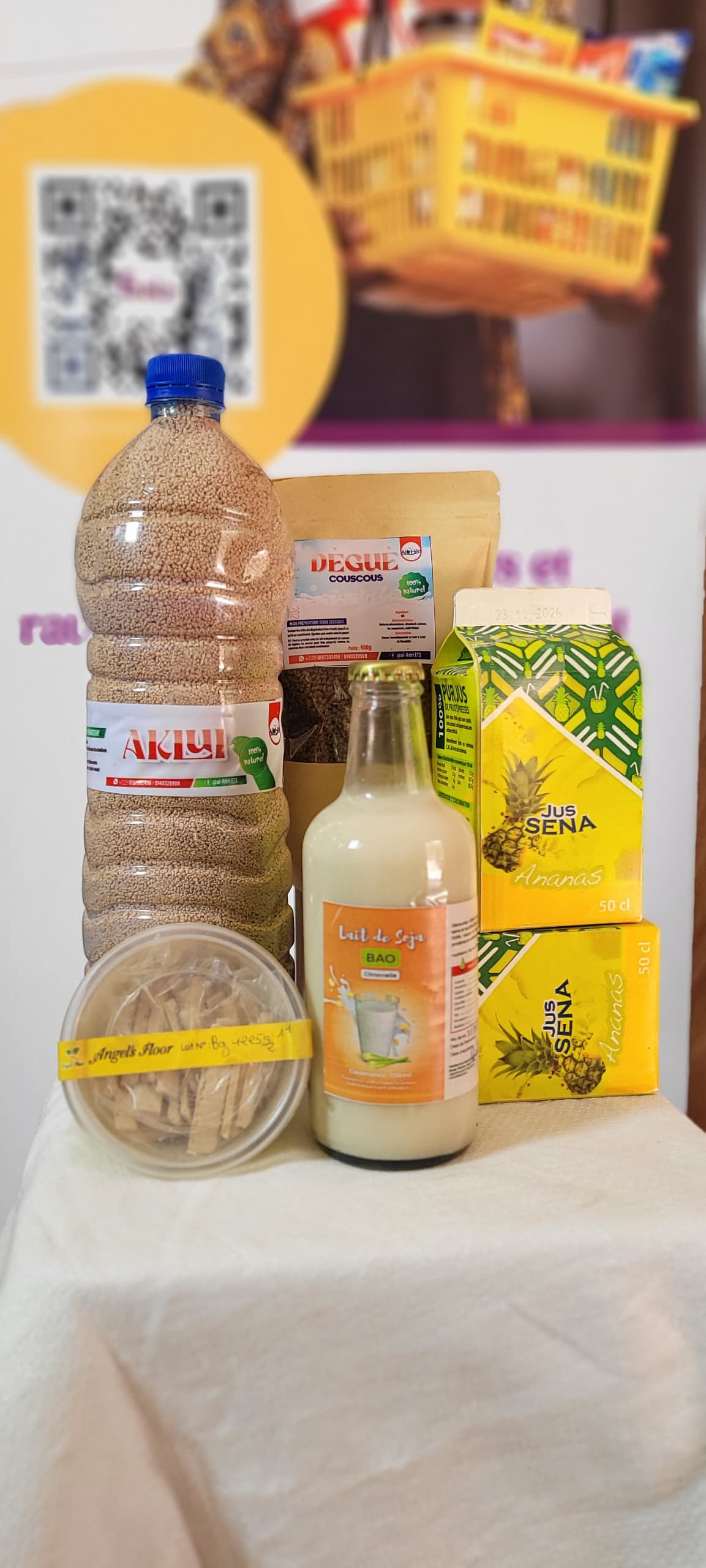 Composition Un bidon de aklui, Une bouteille de lait de soja, Deux cartons de jus d'ananas, Un sachet de dèguè précuit ; Une boîte de pastilles de baobab au gingembre.